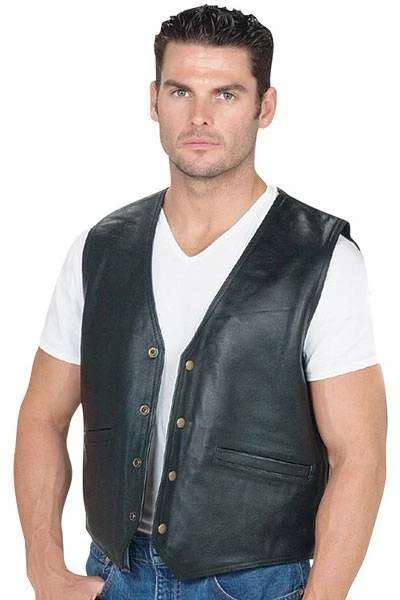 “Soft grain leather, brass buttons, two pockets on the outside, with no laces.”